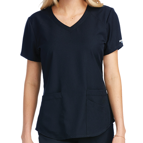 3-Pocket virtual v-neck top with shaped hem, detailed cover stitching and inside back neck contrast binding.